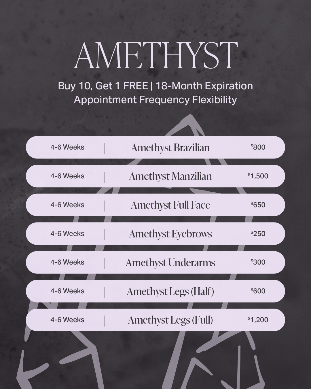 💜 Amethyst Package Buy 10 Get 1 FREE! Save today! Expires in 18 months. Great option for clients who wax every 4-6 weeks!
